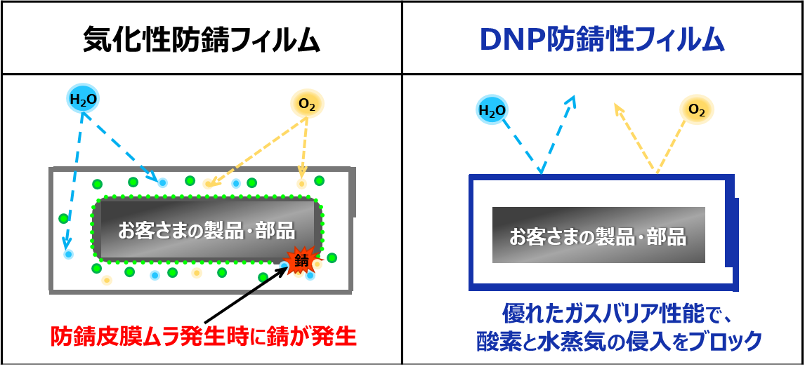 DNP防錆性フィルムは優れたガスバリア性能により、錆の主要因である酸素と水蒸気の侵入をブロックすることで製品を錆から防ぐため、仕向け地や保管場所の環境に関係なく、一定の防錆性能を発揮するため、安定した防錆包材としてさまざまな製品向けにご利用いただいております。