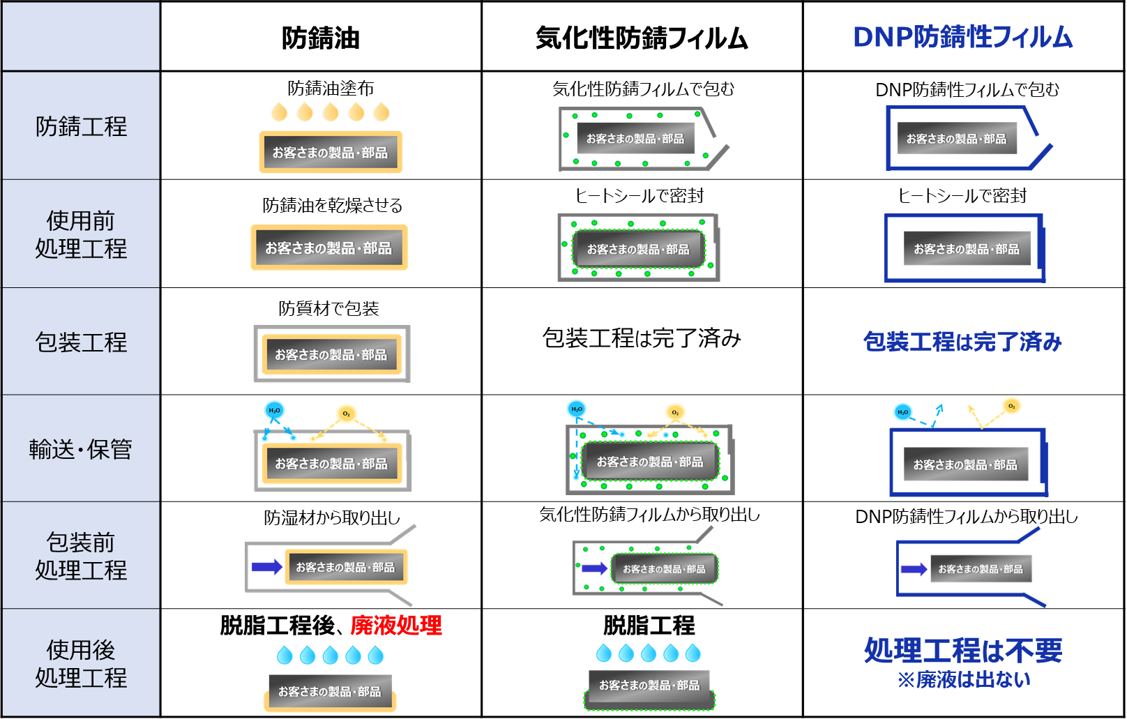 DNP防錆性フィルムは、防錆油を一切使用することがなく、フィルムで包むだけで包装作業が完結し、生産性向上に寄与します。また、開封後の脱脂・洗浄が不要なので、開封するだけで製品の使用が可能です。