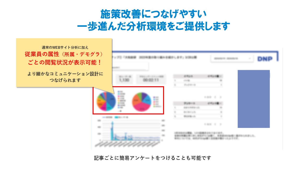 インナーコミュニケーションにおいても分析と改善は不可欠です。従業員の属性に応じたコンテンツの反応を確認することや、アンケートによって定期的に社員のエンゲージメントをスコア化していくことにより、施策に活かすことができます。