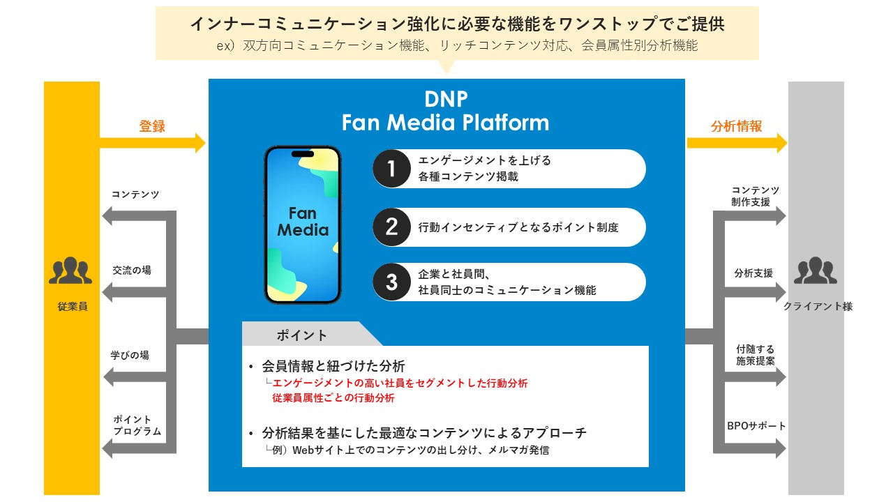DNPのご提供するファンメディアプラットフォームの仕組みを活用し、コミュニケーションを深める社内メディアサイトをつくることで、従業員のエンゲージメント向上をサポートします。