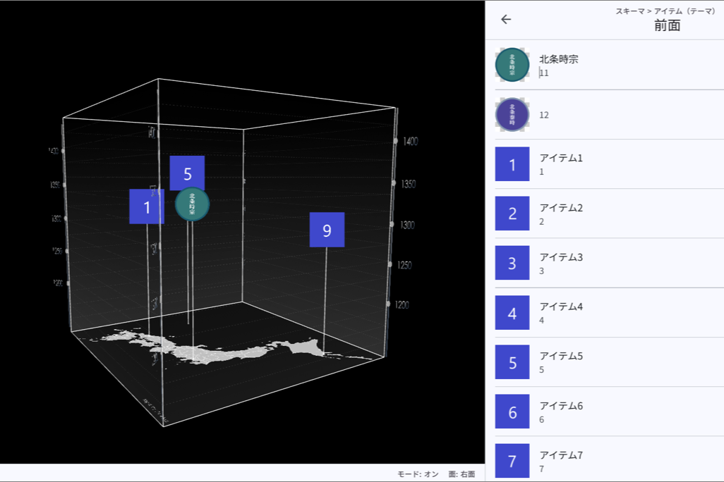 立方体の底面とたて軸を自由に設定し、情報(アイテム)を空間内に配置できます。オリジナリティある独自の観点で、情報同士の関係性が可視化されます。