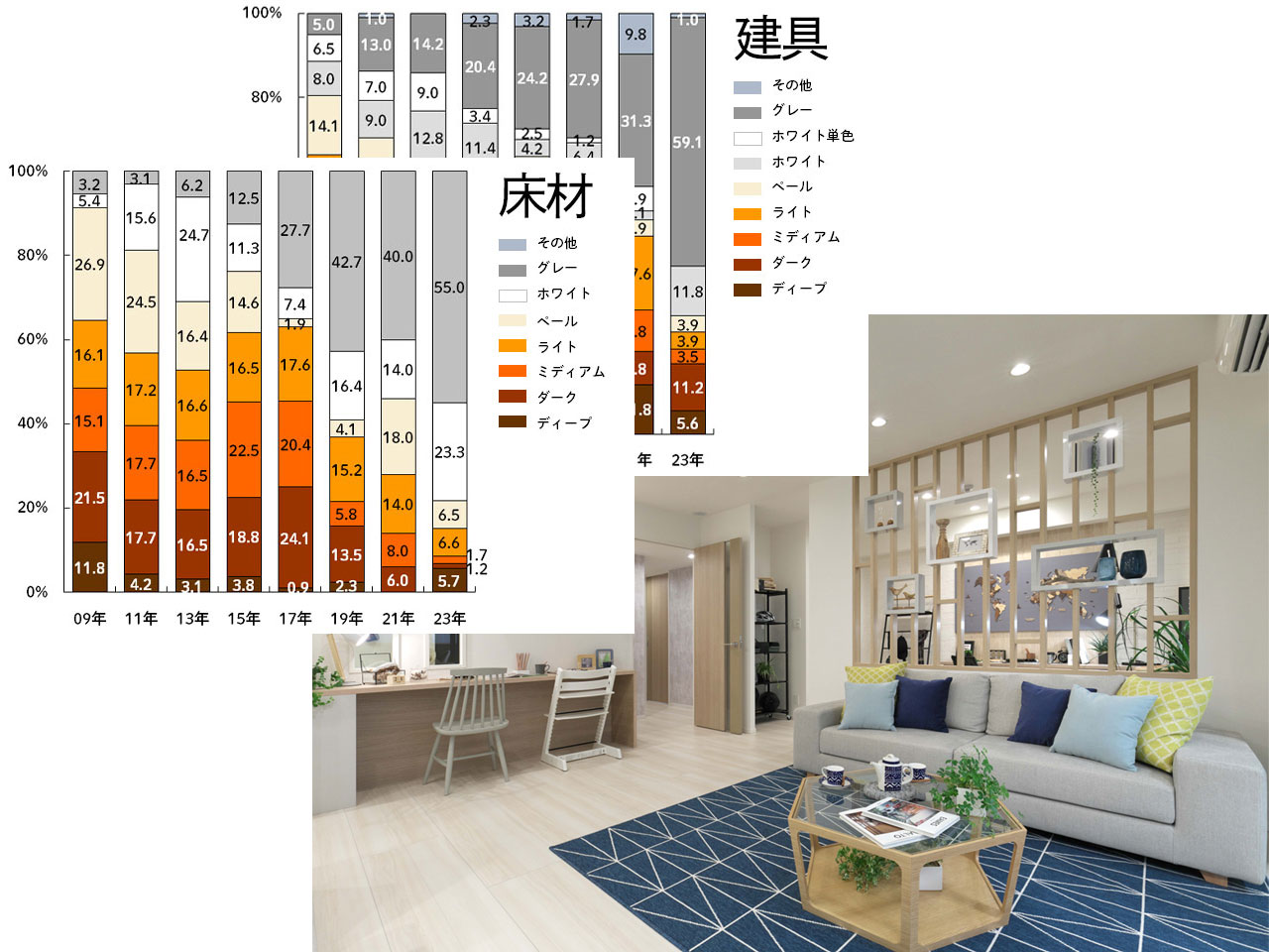 本コラムは2014年の1~3月にかけて、東京・山手線エリアを中心にランダムに抽出したマンションモデルルーム114タイプ(15,000戸相当)におけるインテリア仕上げ材の傾向をご紹介します。- 建装材