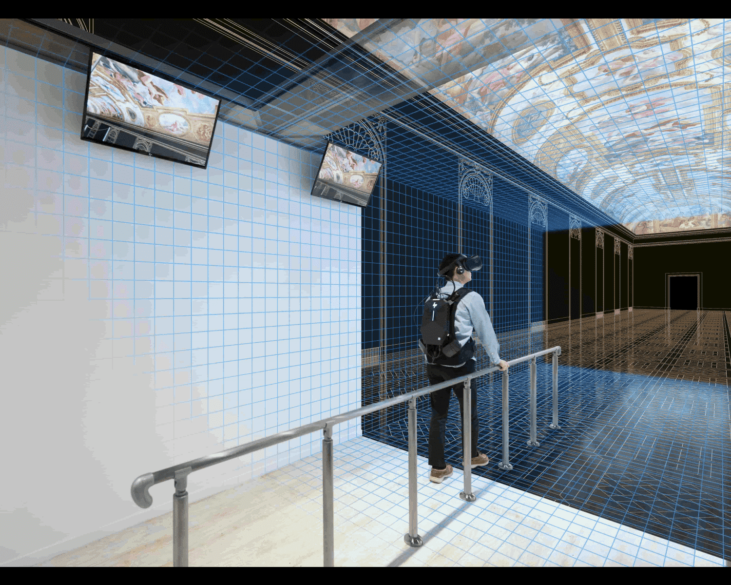 「みどころウォーク」は、ヘッドマウントディスプレイを装着した利用者が、手すりをたどりながら実際に移動することでVR空間内を動き回ることができる鑑賞システムです。
