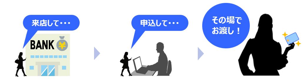 銀行窓口で口座申込後、すぐにキャッシュカードが発行できる店頭サービスです。新規口座開設時のみでなく、磁気不良や紛失等の際にもご活用いただけます。