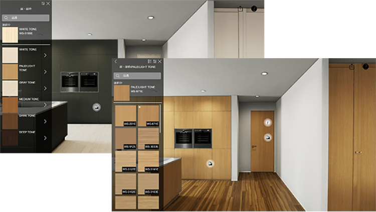 床、扉と枠、収納扉、キッチン扉板の色柄を個別に設定することが可能です。空間全体を360度パノラマで見渡すことができ、室内に居るような感覚でカラーコーディネートをご確認いただけます。