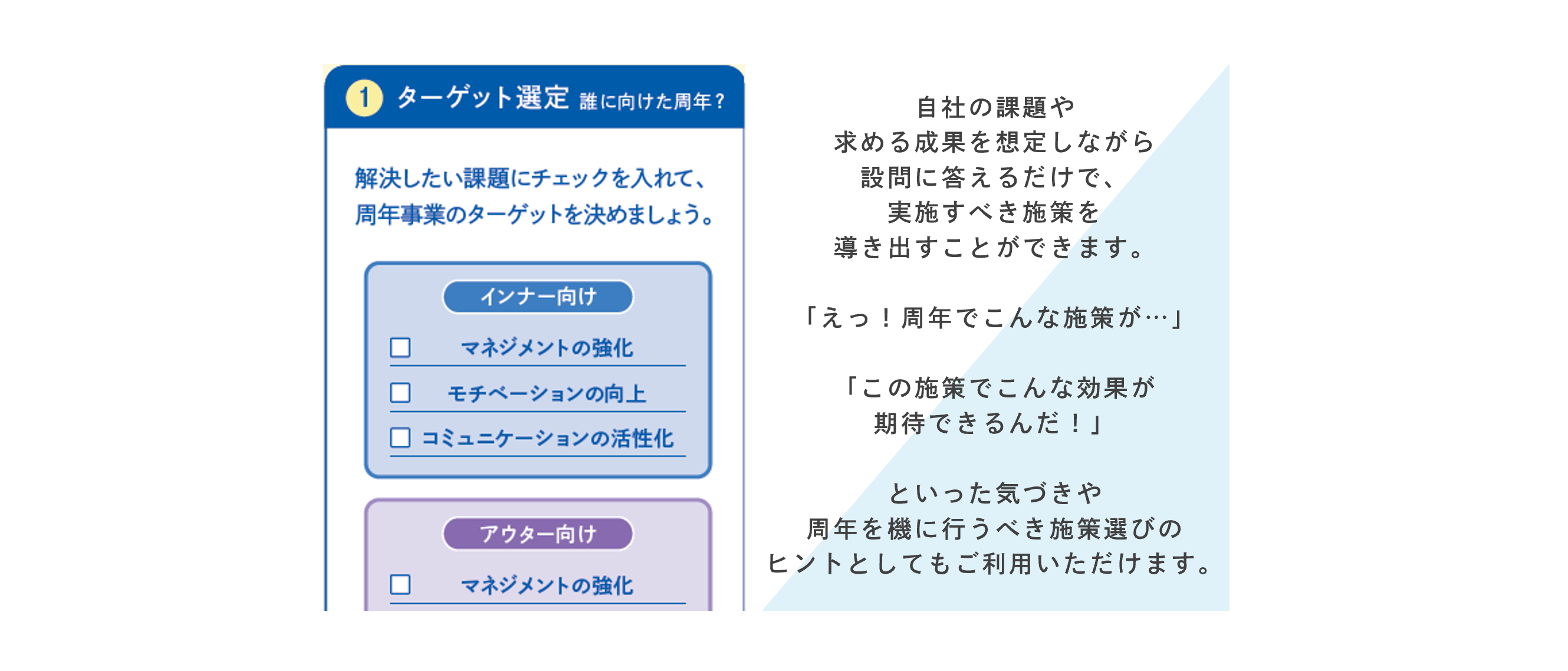 有効な周年施策の選択とスムーズな実施計画策定にぜひご活用ください。
