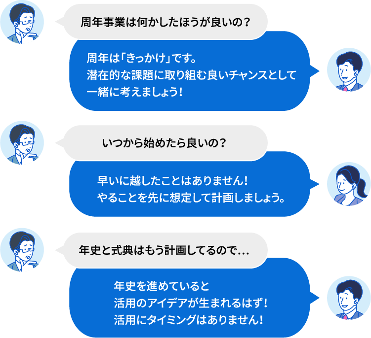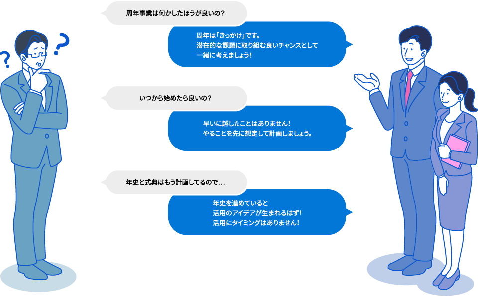 本ページでは、周年での疑問に応える形で、「周年事業とは」から「目的・進め方・事例・ソリューション」をご紹介します。
