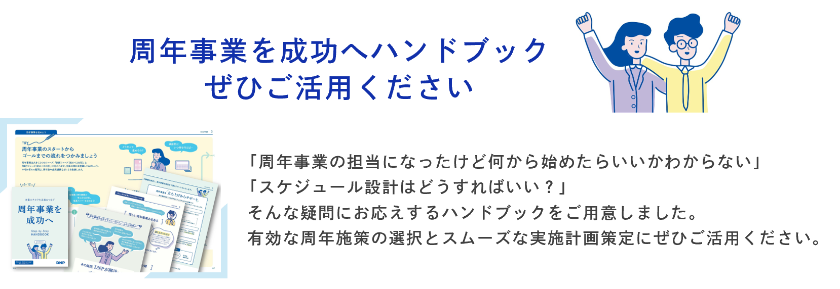 DNPでは、コンセプト設計~施策の制作・実行~効果測定まで、お客さまに寄り添い周年事業を成功まで導きます。