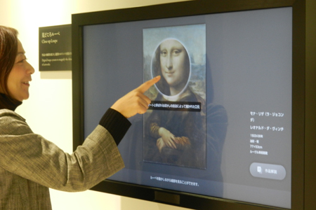 デジタルアーカイブされた美術作品の画像を、高精細タッチパネルディスプレイを用い、肉眼では見落としてしまう作品の細部、技巧、質感などをデジタル上のルーペで拡大し、緻密な観察ができる美術鑑賞システムです。
