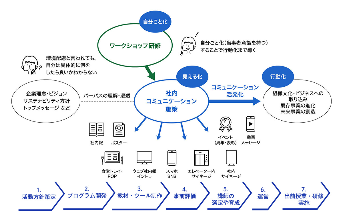 DNPは、展示会やWebなどのコミュニケーション施策や、ステークホルダーの認知理解促進のための環境プログラム等を通じた環境全般の取組みも支援します。下記のような課題に合わせたさまざまなご提案が可能です。