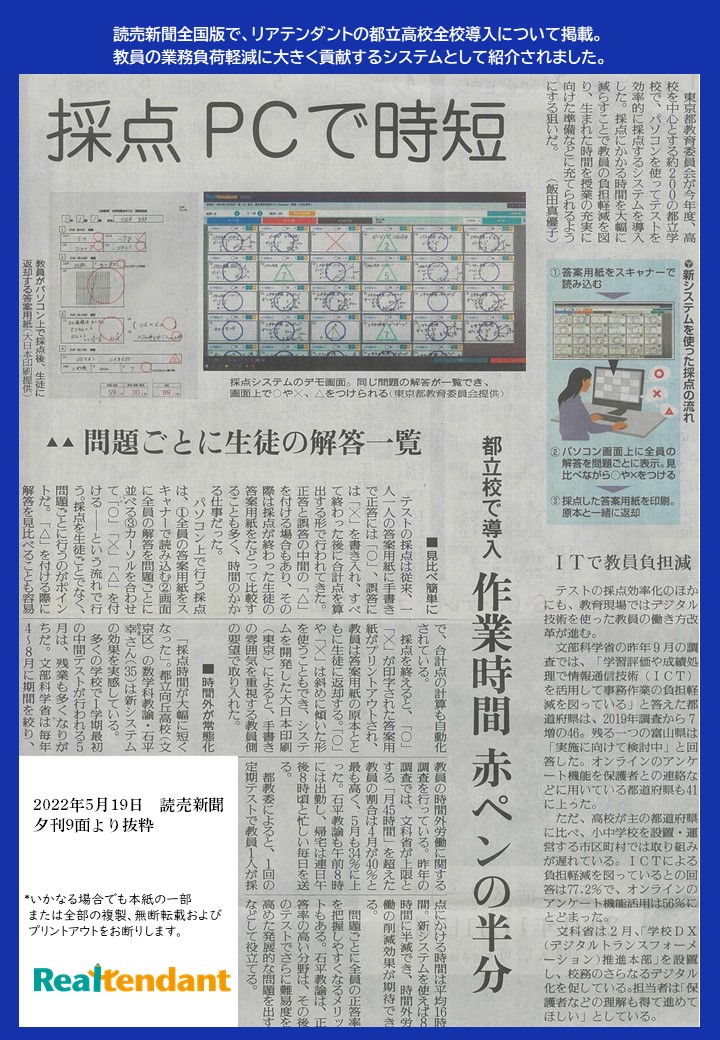 - 2022年06月01日 東京都立高校全校への導入について、5月19日の読売新聞全国版(夕刊)に記事が掲載されました。