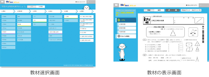 教材は基本学習の定着、個々のつまづき対策、習熟度の定着など、学習の目的に合わせて各教科書に対応した「定着」「標準」「発展」のプリントを出力して活用できます。先生方の教材作成の手間を削減できるだけでなく、児童生徒が自分でプリントを選択して学習をしていくことで主体的な学習にも役立つことから、全国の小中学校で好評を頂いています。