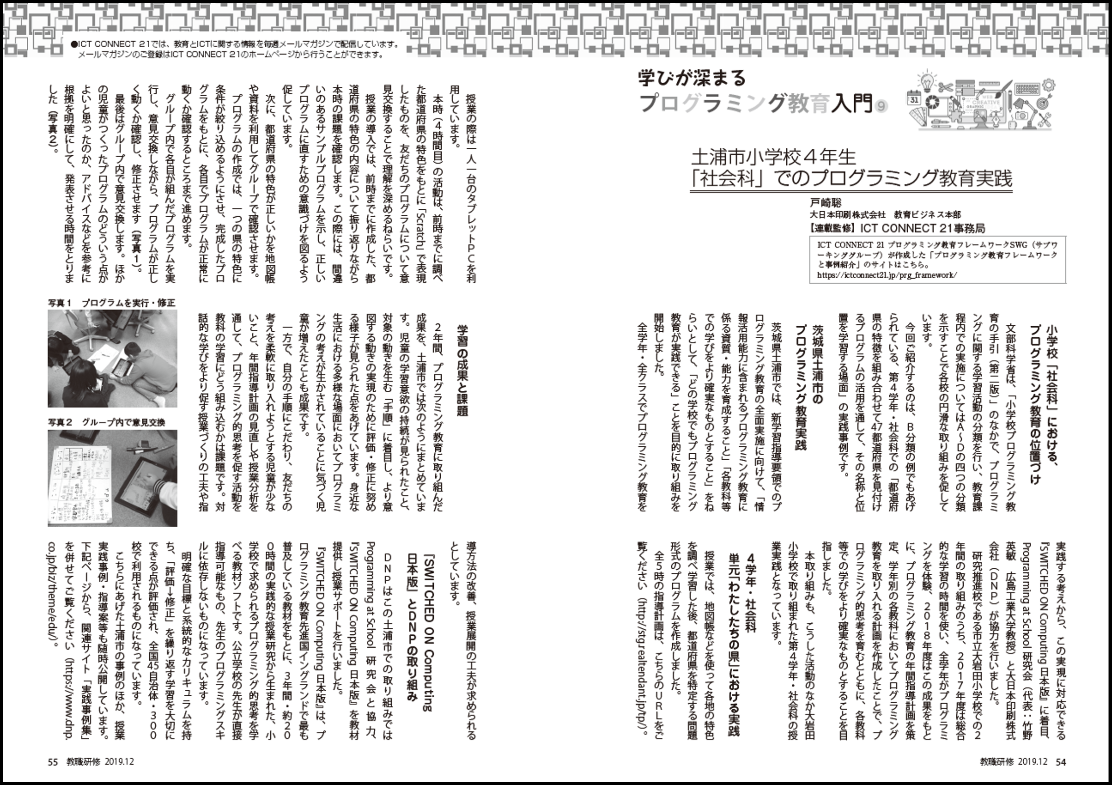 月刊『教職研修』の連載、「学びが深まるプログラミング教育入門」(ICT CONNECT 21 事務局監修)12月号に、社会科でのプログラミング教育事例として、DNP執筆記事が掲載されました。ぜひご覧ください。
