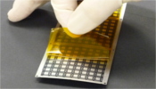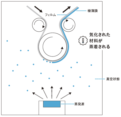 真空中で気化させた材料をプラスチックフィルムなどの基材に蒸着させることで、純度の高い薄膜をコーティングする技術です。DNPは、半導体製造分野で求められる分子レベルの極薄膜を生成する技術を有しています。