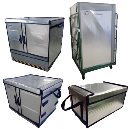 「DNP 多機能断熱ボックス」の現行タイプ。パレットサイズ(左上)、ロールボックスパレットサイズ(右上)、台車サイズ(左下)、ミニチュアサイズ(右下)。 |