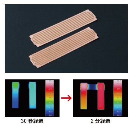 DNP の「ベーパーチャンバー」(上)。銅板との温度変化の違いを可視化するテスト(下)では、ベーパーチャンバーの方が熱の分散効果が高いことがわかる。 |