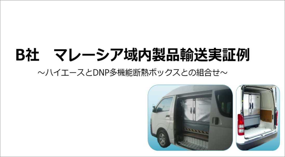 「ワンボックスカーとDNP多機能断熱ボックス」の組合せにより、保冷インフラのない環境で保冷輸送を実現した実例をご紹介。 |