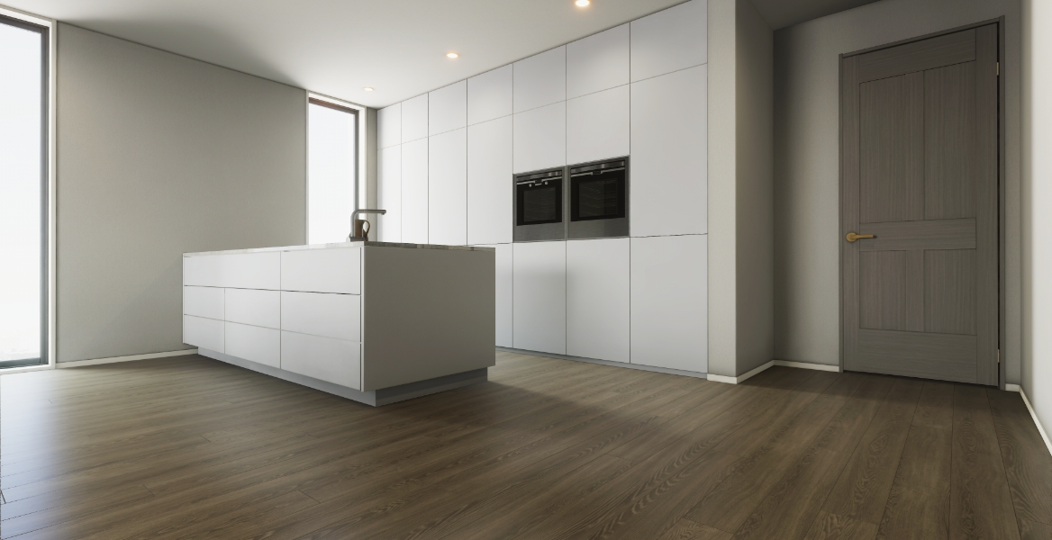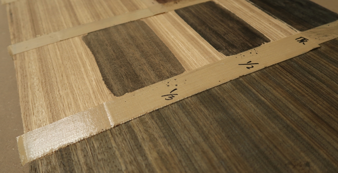 欧州建材市場で最近目にする機会が増えているのが、チェスナット、エルム、そしてヒッコリーです。ナチュラルではっきりした模様が強いヒッコリーですが、もう一押し表情が欲しいと思い、うっすらとした白塗装を施しました。塗装と樹種がマッチしたときの嬉しさはひとしおです。