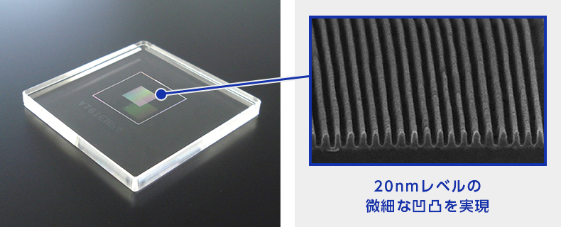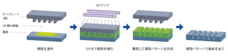 市村最初は、ハンコをつくる技術を応用して半導体をつくってみようということから始まりました。まずは、UV樹脂で型をつくります。これはDNPがもともと持っている技術なのですが、それをナノレベル、つまり1㎜の100万分の1のサイズでやってみようと。