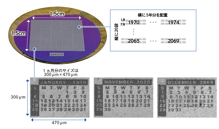 市村知らない人も多いと思いますが、実は結構長い歴史があって。1950年代から半導体製造に関する事業を行っていました。DNPは印刷で培った高度な微細加工技術を持っていますので、その応用ですね。1970年の大阪万博のときには、この微細加工技術を駆使して、1.5㎝×1.5㎝のシリコン板に100年分の日付を彫り込んだ「100年カレンダー」を展示して注目されたこともありました。これは顕微鏡を使わないと見えないほどのもので、とても好評だったんですよ。
