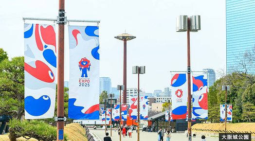 シティドレッシングとは、街中を装飾してイベントを盛り上げる取り組みのことです。DNPは大阪市役所前のミャクミャクのビッグモニュメントや、大型サイネージ、大阪市内の主要エリアに掲出している万博のオリジナルバナーフラッグなどを、大阪府や大阪市と連携しながら制作しています。型にはまらず、パッと見て「おもろいやん!」と目にとまるクリエイティブを目指しました。また、2023年度には市民のメッセージをフラッグにするなど、市民参加型の企画も盛り込んでいます。街中を飾った使用済フラッグを使って、株式会社アーバンリサーチと一緒にサコッシュを作るワークショップも開催。多くの人たちに楽しみながらSDGsを学んでもらえる機会になりました。会期中は来場者へのおもてなしの観点から、カラフルで楽しい万博のデザインシステムを使って、会場近辺の壁や駅などを飾り、期待感を高めるクリエイティブを掲出しています。シティドレッシングの取り組みを紹介する公式サイトもDNPが担当しています。