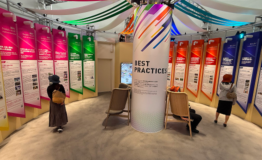 このほか、世界の課題解決に向けた優れた取り組みを紹介する「ベストプラクティス」では、国内外から寄せられたアイデアの募集・選定を行う事務局の運営も担っています。選ばれたプロジェクトやアイデアは、パネルや映像を通じて紹介され、来場者がその背景や意義をわかりやすく理解できるよう工夫されています。これらの展示を通じて、来場者はまるで未来の扉を開くような、胸が高鳴る体験を味わうことができます。