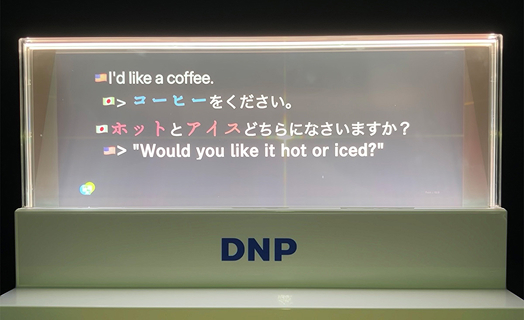 「DNP対話支援システム」は、31言語に対応。同店のレジに設置された透明なディスプレイに、店員と購入客との会話がリアルタイムに翻訳・表示され、コミュニケーションがスムーズになります。「ありがとうございます」など気持ちを込めて表現したい言葉は、「DNP感情表現フォントシステム※」により、フォントを変えて目立たせることが可能です。また、レジ横商品の名称や支払い方法など、購入客に選択してもらう必要のある文言も、あらかじめシステムに登録しておけば、自動的に強調表示されます。現在、DNP感情表現フォントシステムは日本語のみに対応しています。