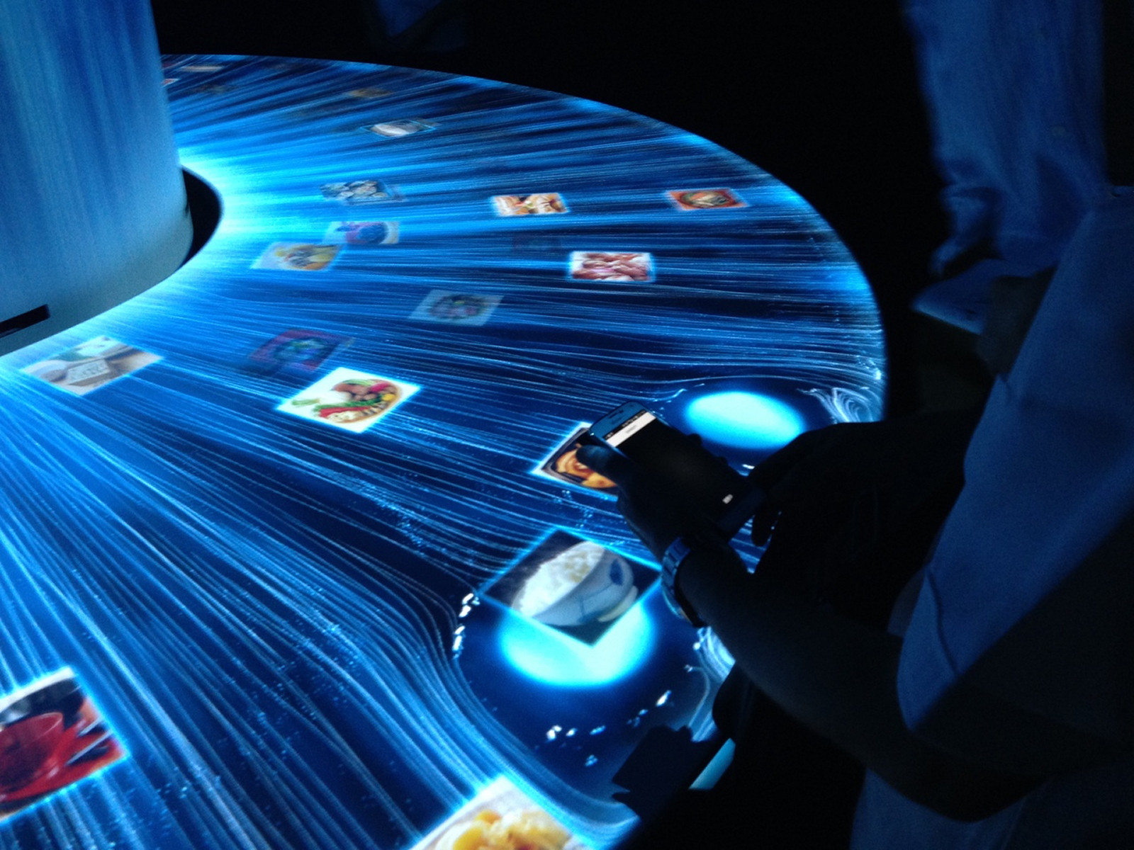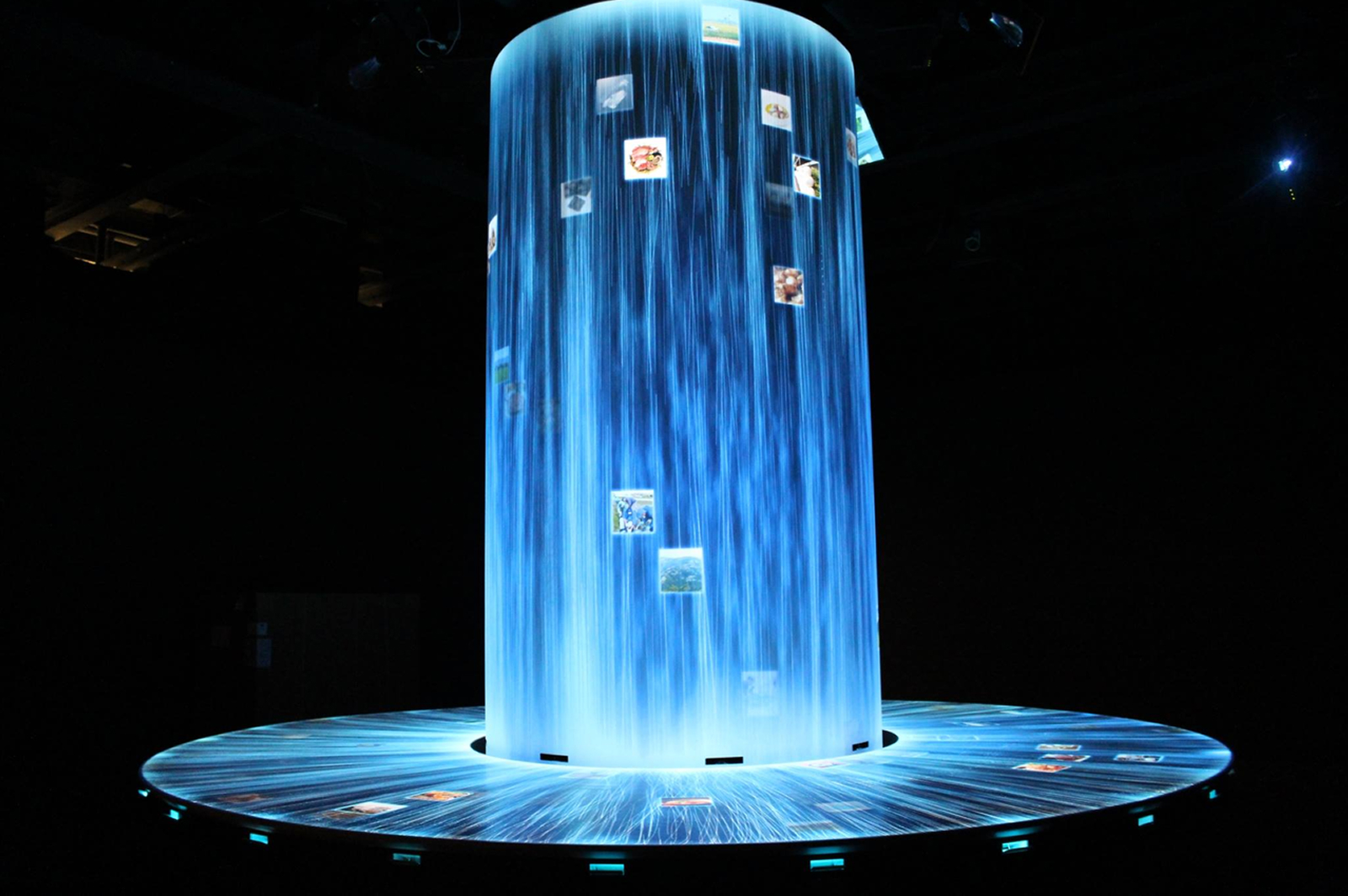 ミラノ万博・日本館の「ダイバーシティ(情報の滝)」は、巨大な滝に、食に関連した大量のコンテンツが流れ、触れるとスマートフォンアプリに取り込むことができる展示。