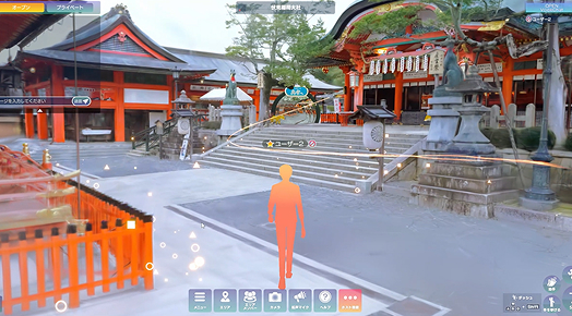 メタバース空間の伏見稲荷大社本殿前 / 実際にお参りしたことのある筆者も、その臨場感に驚きました。まるで本当に現地にいるかのような感覚があります。