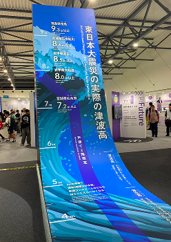 続いて、実際の津波の高さを視覚的に示す「津波タペストリー」が登場。福島県相馬市で観測された9.3メートル以上の津波高を頂点に、各地の津波の規模を表現したこの展示は、目の前にそびえる高さに驚きの声が上がるほどのインパクトがあり、津波の脅威を改めて実感する機会となりました。さらに、客観的なデータを用いた時系列パネルや、震災後から現在に至る復興の歩みを記録した資料、被災者の声を伝えるインタビュー映像などを通じて、東日本大震災の全体像を多角的に伝えています。