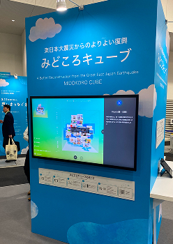 展示の一角には、「DNPコンテンツインタラクティブシステム みどころキューブ®※2」を活用し、コンテンツを体系的に紹介するタッチディスプレイが設置されました。来場者はキューブを自由に操作しながら、自分の興味に合わせて情報を探ることができ、震災や復興についての理解を深める場となっています。イベント終了後も、コンテンツは復興ポータルサイトで公開される予定です。オンラインでもキューブを動かしながら情報を閲覧できる仕組みとなっており、継続的な学びの機会が提供されます。