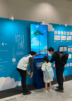会場内には、3.11や復興への想い、応援メッセージを投稿できるメッセージ入力端末を設置しました。来場者から寄せられたメッセージは、万博期間中東ゲートゾーンに常設されているデジタルモニュメント「成長する『奇跡の一本松』」に反映され、一本松が少しずつ成長していく仕組みになっています。このモニュメントは、全国どこからでもオンラインでメッセージを投稿できるため、ぜひ皆さんも応援の気持ちを込めてご参加ください。