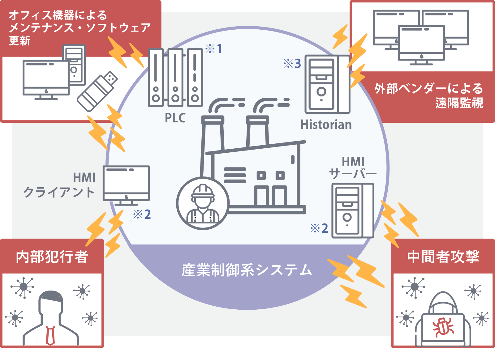 しかしIoT機器やクラウドサービスの導入、サプライチェーン企業や海外拠点とのネットワーク化などDXが進むことで、それらの外部ネットワークを入口にして産業用制御システムにサイバー攻撃を受けるリスクが高まっています。
