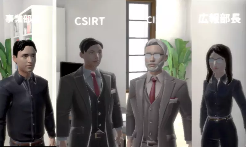 情報セキュリティの責任者であるCISO(Chief Information Security Officer)やCSIRT長・事業部長・広報部長の役割に分かれ、4人一組で各人のPCからメタバースの演習室にアクセスして、約2時間の机上演習を行います。