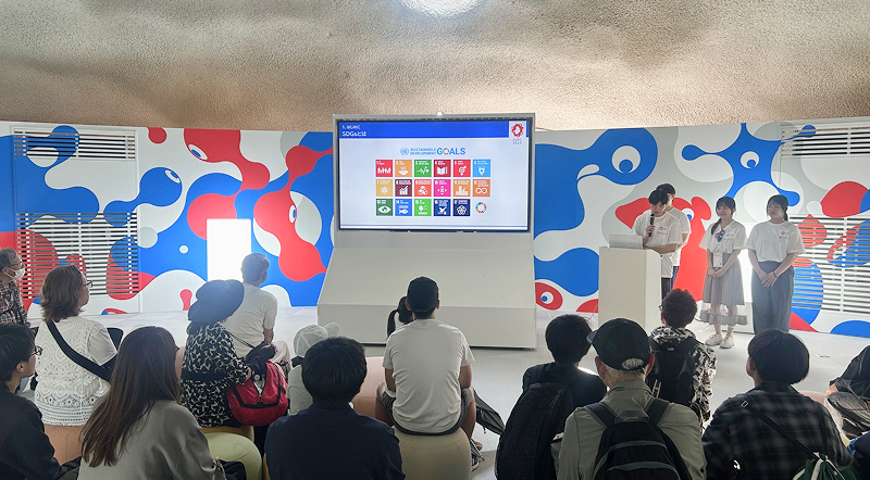 大阪・関西万博のテーマ「いのち輝く未来社会のデザイン」やSDGsの理念に沿って、主に子どもたちや若者を対象にSDGsや環境問題についてのESD※実践の拠点となるのが、西ゲート近くのサステナドームで行われるジュニアSDGsキャンプです。このキャンプでは、DNPが教育コンテンツの企画・制作をはじめ、協賛企業の募集やワークショッププログラムの運営を担っています。また、ドーム内の空間デザインもDNPが手がけています。