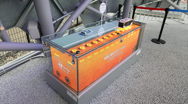 このサイネージは、自動運転や走行中給電システム、エネルギー管理の仕組みなどの技術とそれによって生まれる社会的な価値を、「おもしろく」「わかりやすく」「共感できる」かたちで伝えるために、インフォグラフィックス※3の手法を使って、地面からの給電方法やエネルギーの流れを映像で紹介しています。さらに、サイネージの上部には、スマートフォンのワイヤレス充電器を搭載したe Moverの模型を設置。来場者が「ついスマートフォンを置いて充電してしまう」ような楽しい体験を通じて、走行中給電システムという画期的な仕組みや技術を感じてもらえるユニークな仕掛けになっています。
