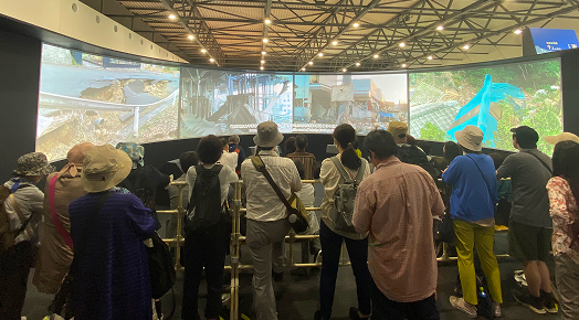 展示の導入部では、パノラマ型の大型スクリーンにて、東日本大震災当時の記録映像を上映。地震や津波による被害の様子を改めて伝える構成で、来場者はその場にいるかのような感覚を覚えるほど、深く見入っていました。