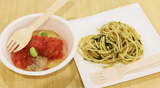 (左)常磐(じょうばん)ものの煮凝(にこご)りとトマトのマリアージュ、(右)松川浦(まつかわうら)産アオサとシラスのパスタ いずれも福島県