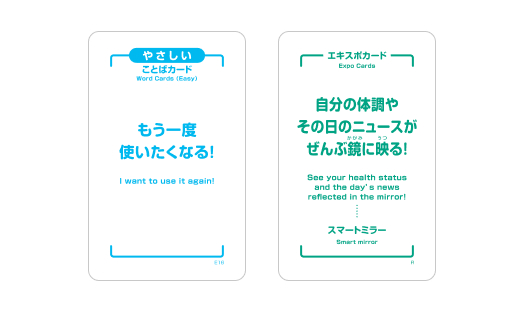 ワークショップには、幼児から大人まで幅広い年代の人たちが参加。はじめに、参加者が日常生活で感じる「もやもや」(困りごと、不便に思うことなど)をカードに書き、ボード上の「あおくらげ(もやもやリスト)」に貼ってリストアップします。次に、自分以外のカードも含めたさまざまな「もやもや」の中から1つを選び、解決するためのアイデアづくりに挑みます。この企画ならではの魅力が際立つのは、ここから始まる“アイデアを形にする”ステップです。使用するのは、アイデアの方向性を広げる「ことばカード」と、万博で実際に体験できる未来の技術が記載された「エキスポカード」。2種類のカードからランダムに1枚を選びます。そこに書かれた「ことば」と「技術」をヒントに、ワークシートボードの案内に沿って、課題を解決するアイデアをひらめいていきます。こうして各々が導き出した「ひらめきアイデア」は、ボードの「みどりくらげ(ひらめいたみんなのアイデア)」に貼っていきます。
