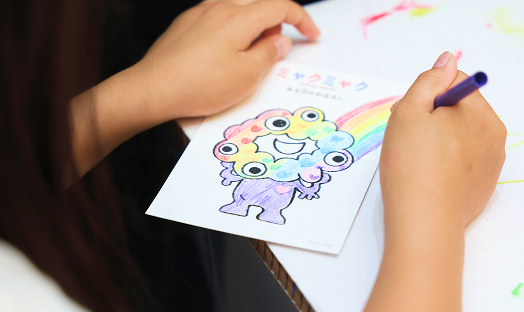 ミャクミャクは「色の変化でメッセージを発信する」キャラクターであることから、ワークショップでは、この絵本に描かれたミャクミャクを、参加者の「今の気持ち」に合わせて好きな色で塗ってもらいました。完成した「自分だけのミャクミャク」は誰かと共有できるように、塗り絵の紙をポストカードの仕様にしています。塗り絵を通して、「自分で考えたことを表現する」「それを人と共有する楽しさを知ってもらう」ことが狙いです。