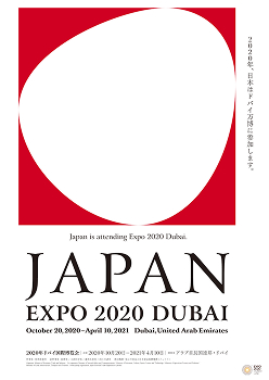 2020年ドバイ国際博覧会 日本館のポスターは、大きく配されたロゴマークが印象的