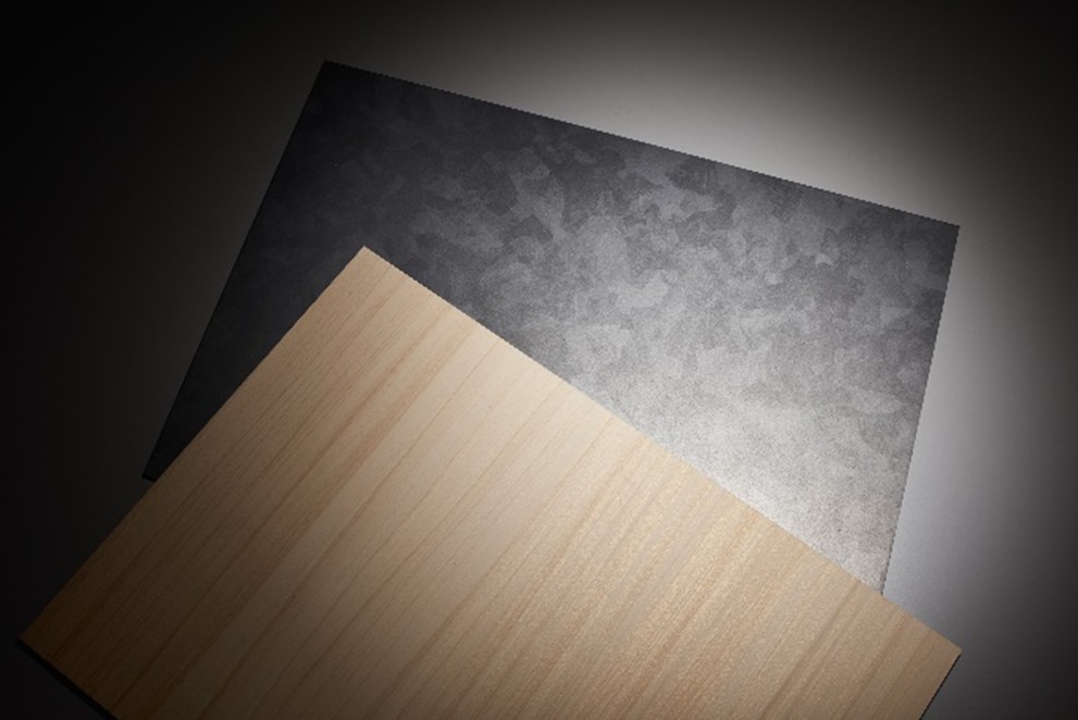 木・石・金属などの天然素材が持つ色や質感をリアルに表現しています。また、設計者のコンセプトに合わせて色をカスタマイズできます。今回の「KUMA TOWER」では、明るいナチュラルカラーの木目と、リン酸処理仕上げのような金属調の絵柄が採用されました。