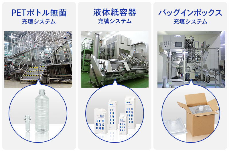 飲料などの商品を適切に充填するには、包材の知識も必要不可欠です。大日本印刷株式会社が有する優れた包材技術とコンバインし、高水準な包材とシステムのマッチングを実現します。