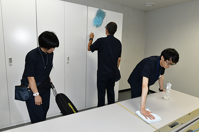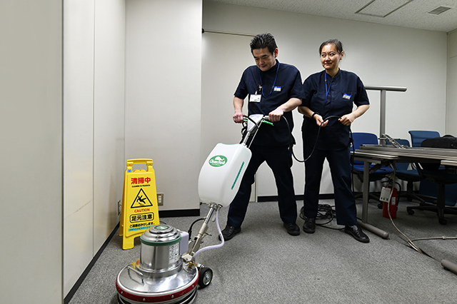 2022年4月より、ビルクリーニング業務をスタートしました。DNPグループのオフィスビルなどを対象とした日常清掃や定期清掃を行っています。 |