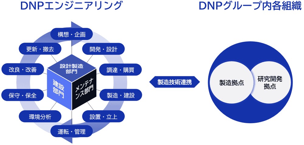 工場設備に関わるエキスパート集団として、DNPグループ内の各組織と連携しながら設備の構想・企画から更新・撤去までを一元管理しています。