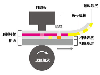 热升华打印使用其专用色带和相纸进行照片打印。该色带在薄膜上涂有三种基色染料墨水(黄品青)。除色带外,还需另一种树脂涂层专用相纸来固定转印的染料。热升华打印通过将色带上的颜色染料(黄品青),按照打印头释放的热量比例转印到接收纸上,从而形成高清图像。