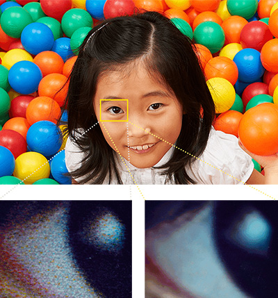 用喷墨打印机打印照片,将照片放大后会看到线条状和颗粒状的瑕疵,而DNP的热升华打印机可以柔和地处理这些瑕疵(※)