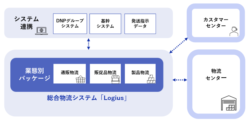 製品の多品種・小ロット化、納品リードタイムの短縮、物流品質の向上、そしてトータルコストの削減、現代のロジスティクスには、これまで以上に高度で柔軟な対応が求められています。DNPロジスティクスでは、こうした多様なニーズに応えるため、従来の物流管理手法を抜本的に見直し、発送指示から在庫管理、流通加工、データ分析までを一元管理できるWMSソリューションとして、自社開発の「総合物流システム Logius(ロジアス)」を提供しています。