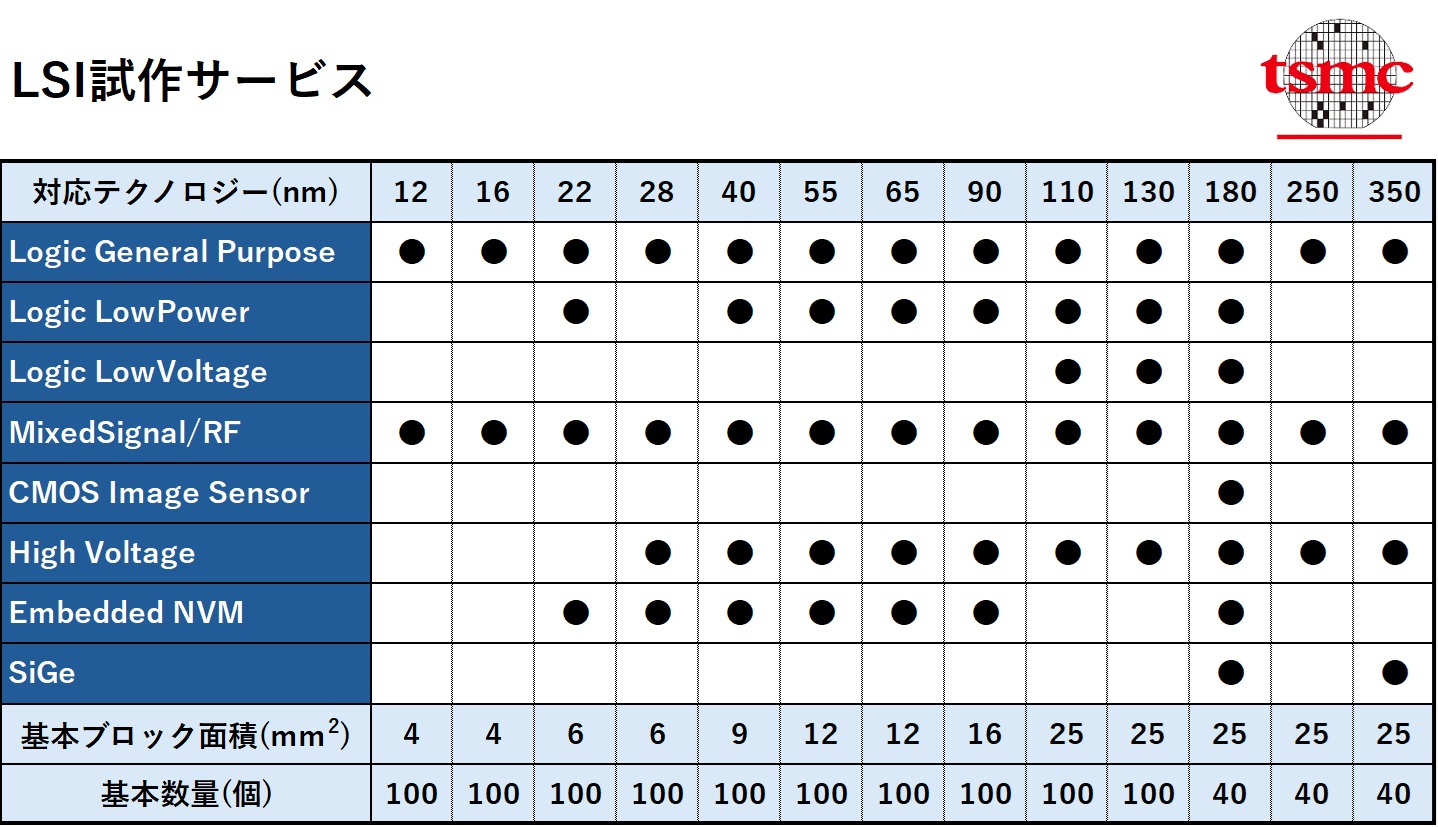 - 12nm~0.35umまでLogic・MixedSignal/RF・EmbFlash・LowPower・LowVoltage・CMOSセンサー・SiGe等さまざまなテクノロジーが利用可能です(以下表をご参照ください)。