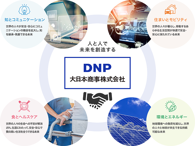 大日本商事はDNPグループが掲げる4つの成長領域、「知とコミュニケーション」「住まいとモビリティ」「食とヘルスケア」「環境とエネルギー」を軸に、国内はもちろん世界中の企業と有機的に連携し、あらゆるモノやサービスに新しい価値を与えるため、最良の原料や資材、加工品、製品を調達・供給するとともに、DNPグループの先進の技術力を活かした新素材・新製品の開発などに取り組んでいます。